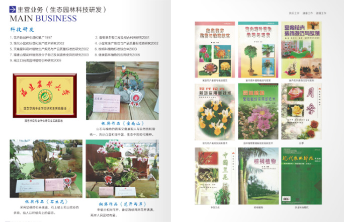 公司專業力量雄厚科研技術優勢強,擁有各類專業技術人才61人,其中省級綜合評标專家3人、高級工程師4人,擁有福建省花卉研究中心和福建農林大學學位研究生實踐基地兩大科研平台。先後承擔《健康園林植物的應用研究》、《鄉土觀賞花木馴化繁育》、《觀果花卉生産開發研究》、《名優花卉新品種引種、馴化與推廣》、《現代小盆花标準化生産技術》等十幾項研發項目,應用于生産經營後取得良好效益,其中《福建山櫻花種質資源分子标準及其遺傳變異的研究》被福建省人民政府授予科學技術三等獎,承擔并定制了《棕榈科植物标準綜合體》、《盆栽人參榕生産技術規範及産品質量等級》等國家行業标準和福建省地方标準,編著出版了《現代花卉栽培實用新技術》、《室内觀葉植物栽培與觀賞》、《棕榈植物》等十幾部園林花卉專著。